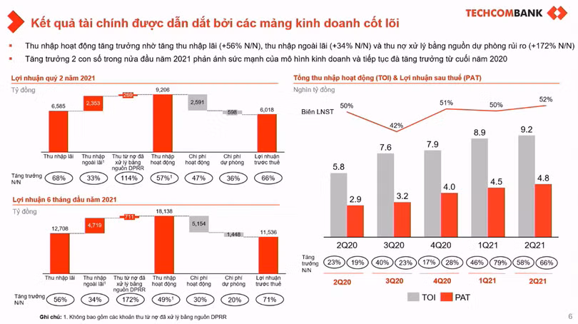 Trong nửa đầu năm 2021, Techcombank báo lãi trước thuế hơn 11,5 nghìn tỉ đồng, tăng 71,2% so với cùng kỳ năm trước. Tổng thu nhập hoạt động (TOI) của Techcombank đạt mức 18,1 nghìn tỉ đồng, tăng trưởng 52,1% so với cùng kỳ năm trước.