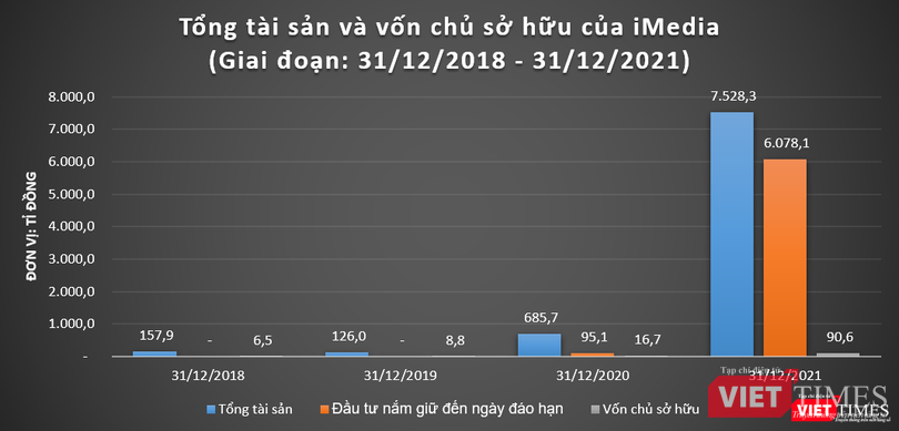 Tính đến ngày 31/12/2021, tổng tài sản của doanh nghiệp này đạt mức 7.528,3 tỉ đồng, cao gấp 10,9 lần so với đầu năm. Trong đó, các khoản đầu tư nắm giữ đến ngày đáo hạn chiếm tới 80,7% tổng tài sản, với số dư lên tới 6.078,1 tỉ đồng – cao gấp 63,9 lần so với cuối năm 2020. Các năm 2018 và 2019, iMedia đều không phát sinh các khoản đầu tư này.