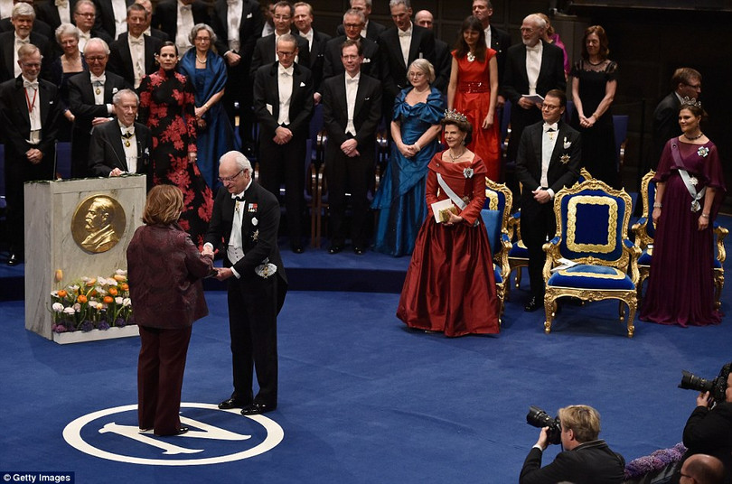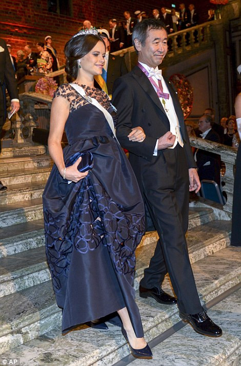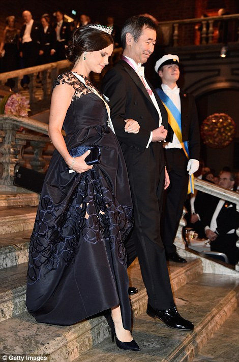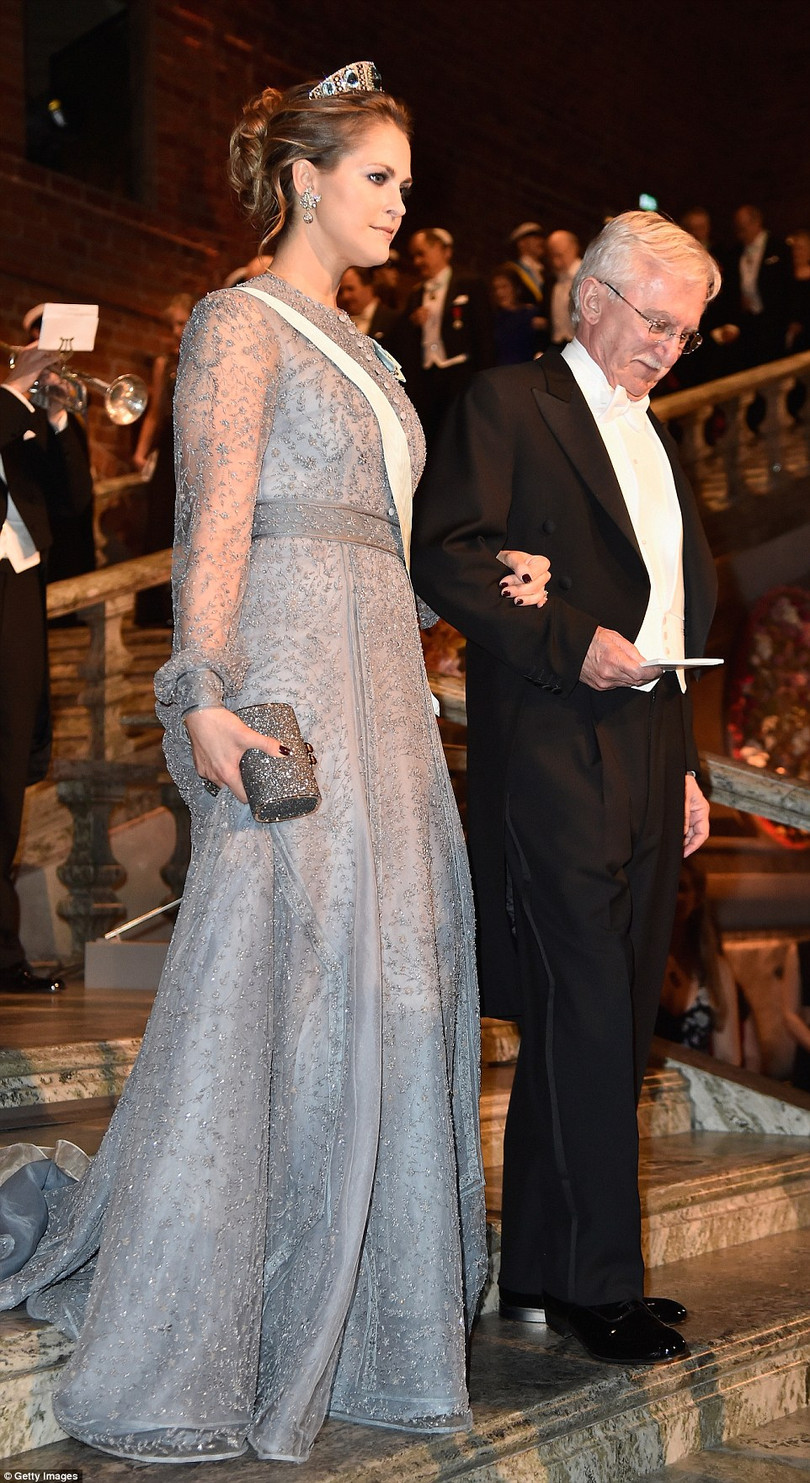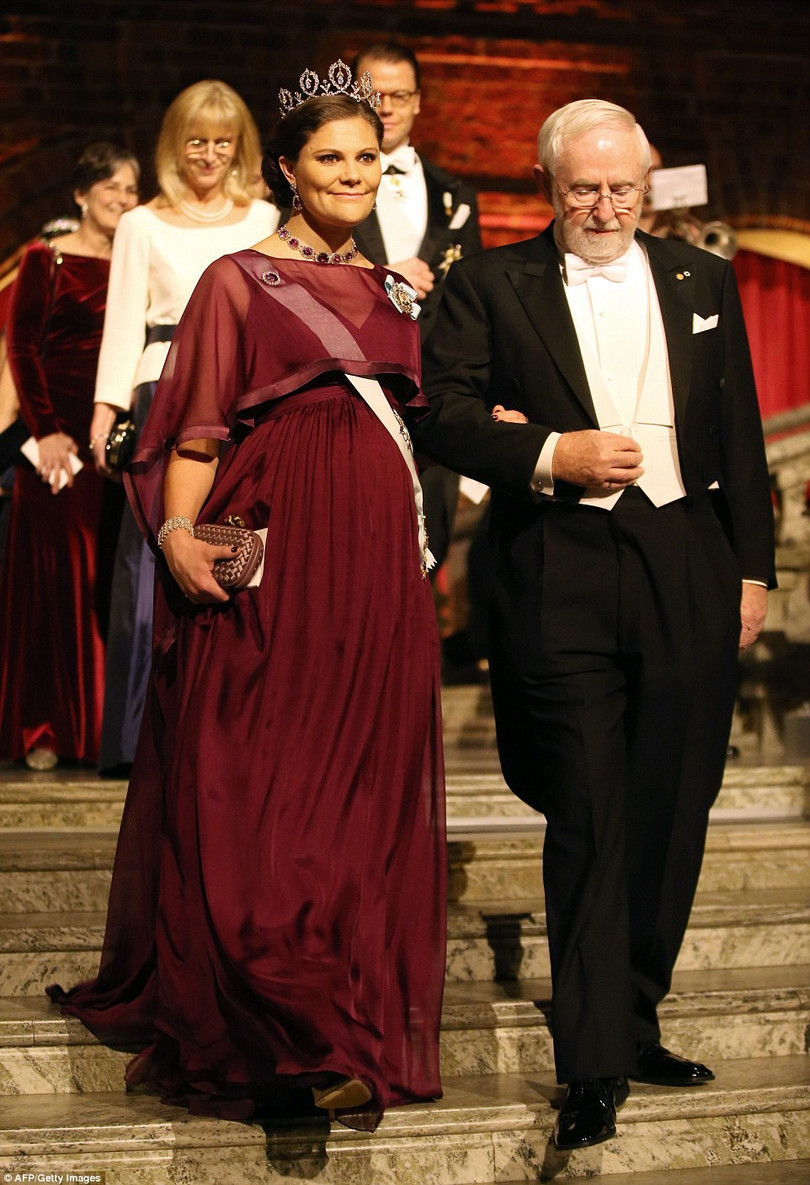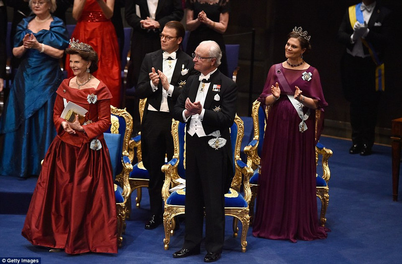Công chúa Victoria đang mang bầu trong chiếc váy thanh lịch, đầu đội chiếc vương miện nạm kim cương, đi cùng cô là nhà khoa học Canada Arthur B McDonald - đồng giành giải Nobel hóa học 2015 trong trang phục đuôi tôm.