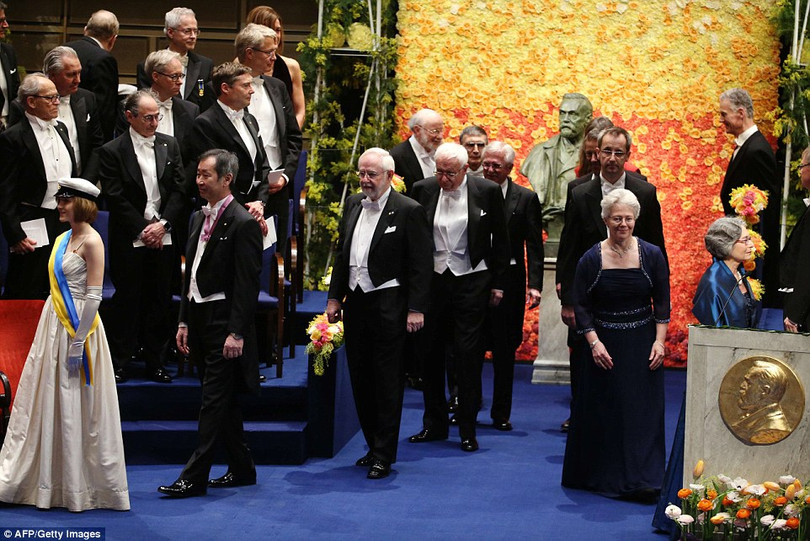 Bà Michiko Kajita - phu nhân của nhà khoa học Takaaki Kajita (Nhật Bản) đạt giải Nobel vật lý 2015 trong trang phục Kimono truyền thống của Nhật Bản. Đi cùng bà là Vua Thụy Điển Carl XVI Gustaf trong áo đuôi tôm.