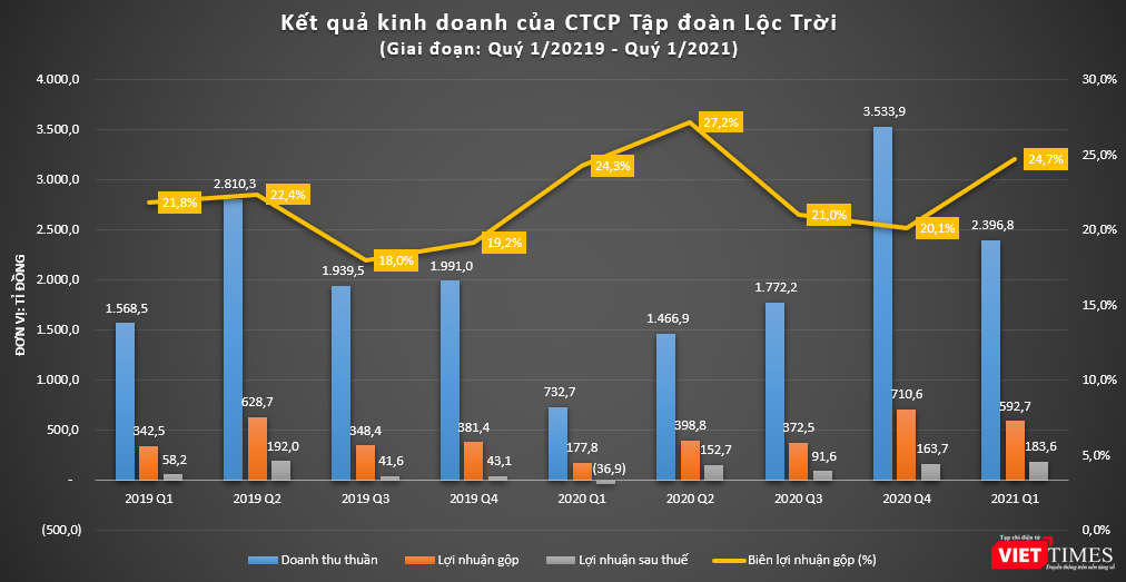 CTCP Tập đoàn Lộc Trời (Mã CK: LTG) vừa công bố kết quả kinh doanh Quý 1/2021 với doanh thu thuần ở mức 2.396,8 tỉ đồng, tăng gấp 3,2 lần so với cùng kỳ năm 2020 – giai đoạn hoạt động kinh doanh của LTG chịu nhiều tác động bởi dịch Covid-19.