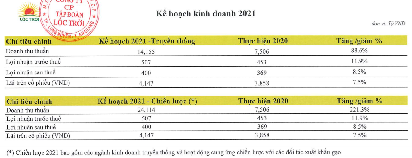 Đồng thời, ban lãnh đạo LTG cũng đề ra kế hoạch chiến lược với doanh thu thuần đạt 24.114 tỉ đồng, lợi nhuận sau thuế đạt 400 tỉ đồng, lần lượt tăng 221,3% và 8,5% so với năm 2020. Kế hoạch này bao gồm các ngành kinh doanh truyền thống và hoạt động cung ứng chiến lược với các đối tác xuất khẩu gạo.