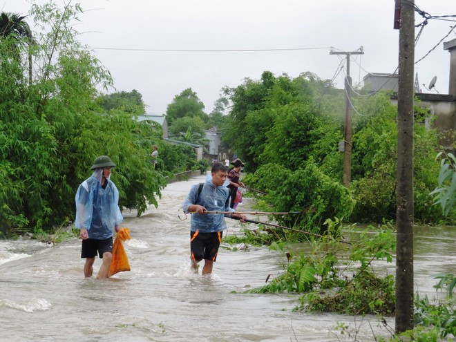 Hàng tấn cá thoát ra ngoài theo mưa lũ, một số người dân phường Phương Nam đánh bắt cá ngay trên đường ra vào khu dân cư.