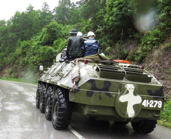 Xe bọc thép lội nước túc trực để di dời dân.