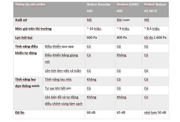 Dựa vào bảng so sánh trên, có thể thấy rằng, Probot Nelson A5 Wi-Fi có tính năng nổi trội hơn hai sản phẩm cùng phân khúc. Đây là robot sở hữu nhiều tính năng thông minh của các dòng robot hút bụi cao cấp như điều khiển qua app hoặc giọng nói, chế độ hút và lau đa dạng, tính năng tự động lên bản đồ ảo và điều chỉnh khu vực làm sạch... Dòng máy này có lực hút bụi mạnh (đạt 1.600 Pa), tương đương với máy hút bụi thông thường dù kích cỡ chỉ bằng một phần ba, đảm bảo hút sạch mọi bụi bẩn trong nhà.