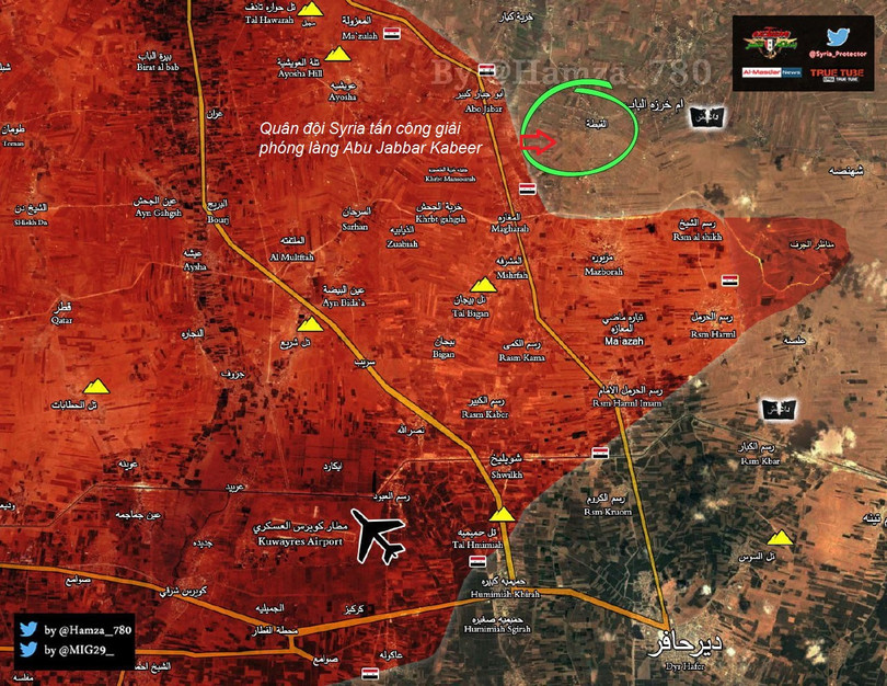 Giao chiến đang diễn ra ác liệt gần làng Alisah, phóng viên chiến trường Al-Masdar News dự kiến ngôi làng này sẽ được giải phóng trong vài giờ tới. Đến thời điểm này, quân đội Syria đang cách bờ sông Euphrates khoảng 27 km.