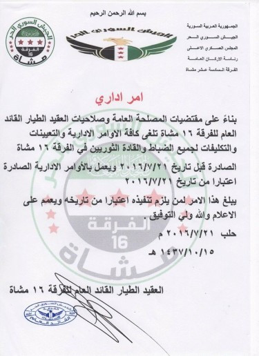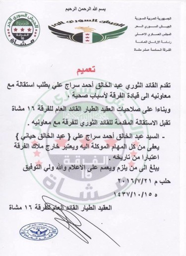 Chỉ huy cao cấp của Sư đoàn 16 FSA phải từ bỏ chức vụ sau những tổn thất nặng nề trên trục đường Layramoun / Khaldiyah về trang thiết bị và sinh lực. Không thể ngăn chặn cuộc tiến công của Sư đoàn cơ giới số 4 Quân đội Syria, chỉ huy trưởng từ nhiệm có nhiều khả năng sẽ đào thoát sang Thổ Nhĩ Kỳ cùng với trợ lý.