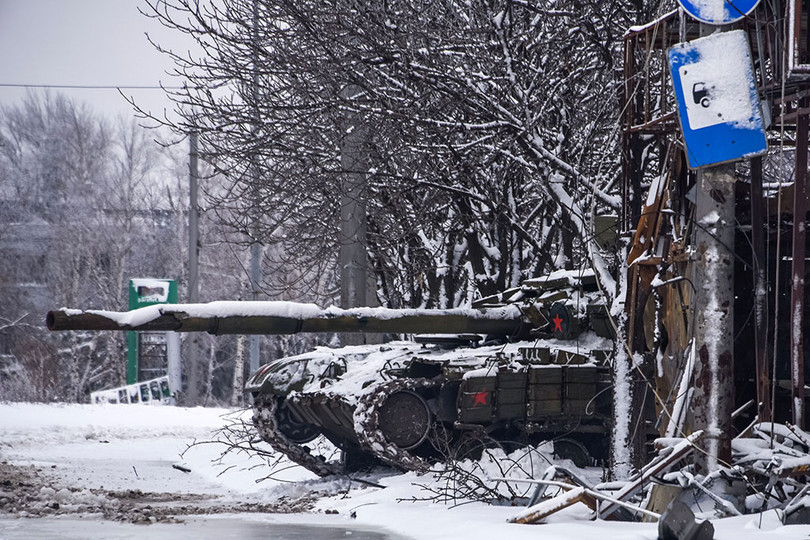 Một chiếc xe tăng của dân quân ly khai trên đường phố