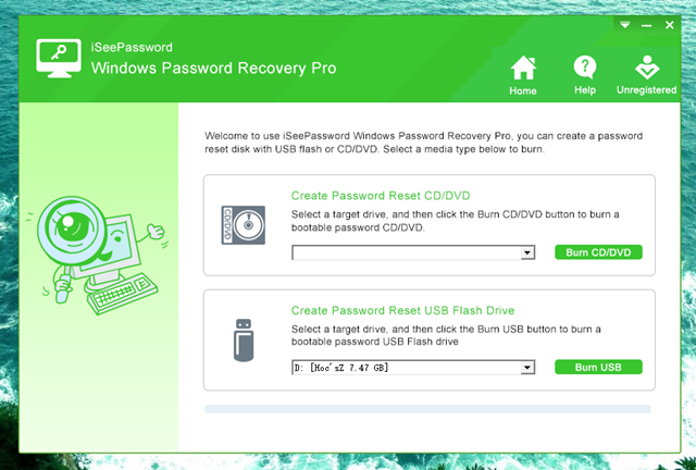 Khi đã hoàn tất việc cài đặt, bạn hãy khởi động phần mềm lên. Lúc này, bạn sẽ thấy có 2 lựa chọn giúp khởi tạo công cụ khôi phục lại mật khẩu cho Windows. Bao gồm sử dụng USB và CD/DVD. Tùy theo điều kiện hiện tại của mình mà bạn hãy nhấp vào lựa chọn tương ứng.