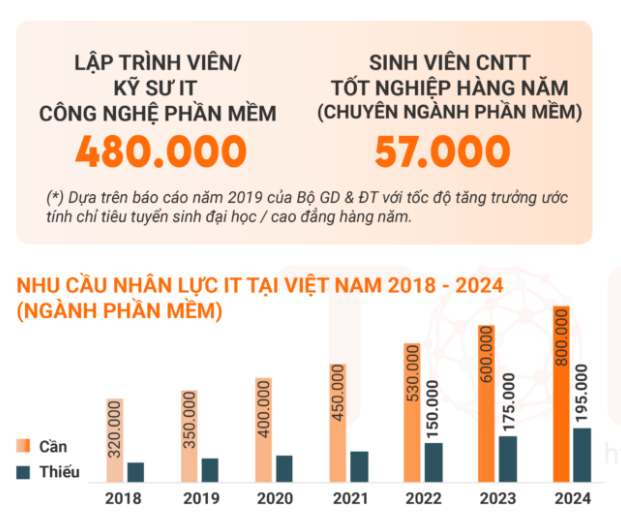 TopDev cho biết, dù mức lương và thưởng của ngành này đang tăng lên đáng kể, nhưng dự đoán từ năm 2022 – 2024, Việt Nam vẫn thiếu hụt 150.000 – 195.000 lập trình viên/ kỹ sư hàng năm. Khoảng cách này dự kiến còn cao cho đến năm 2024 khi nhu cầu lên tới 800.00 lập trình viên.