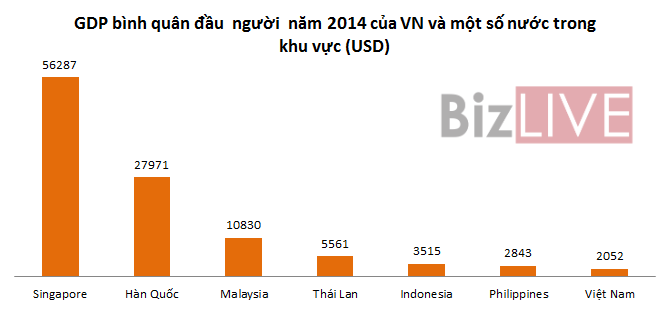 Theo tính toán, GDP bình quân đầu người của Việt Nam năm 2014 chỉ bằng 3/5 của Indonesia, 2/5 của Thái Lan; 1/5 của Malaysia; 1/4 của Hàn Quốc và bằng 1/27 mức GDP bình quân của Singapore.