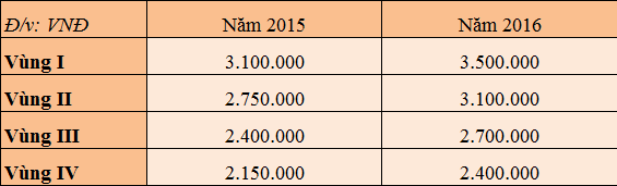Mức tăng cụ thể áp dụng cho các vùng năm 2016 như sau:
