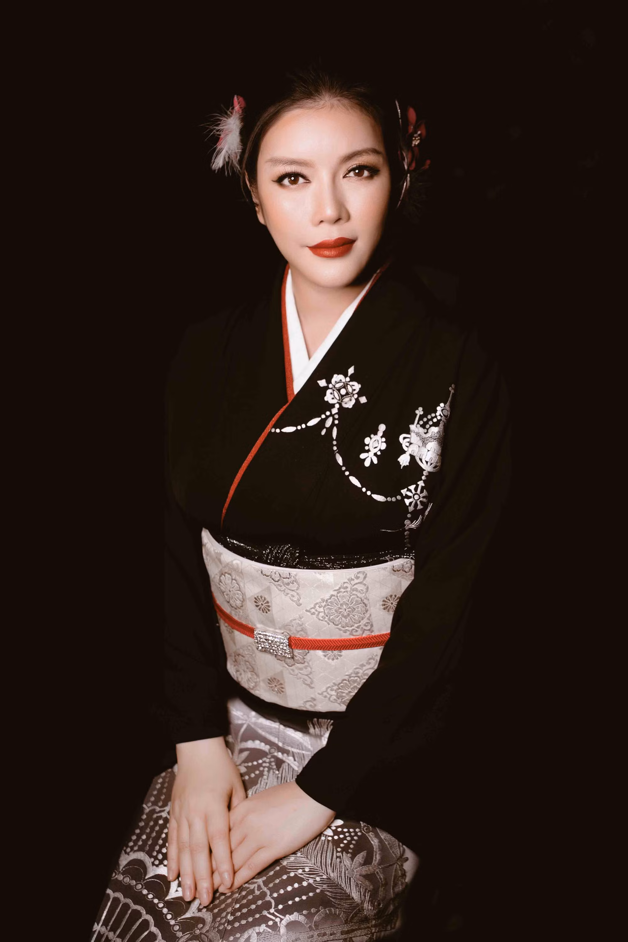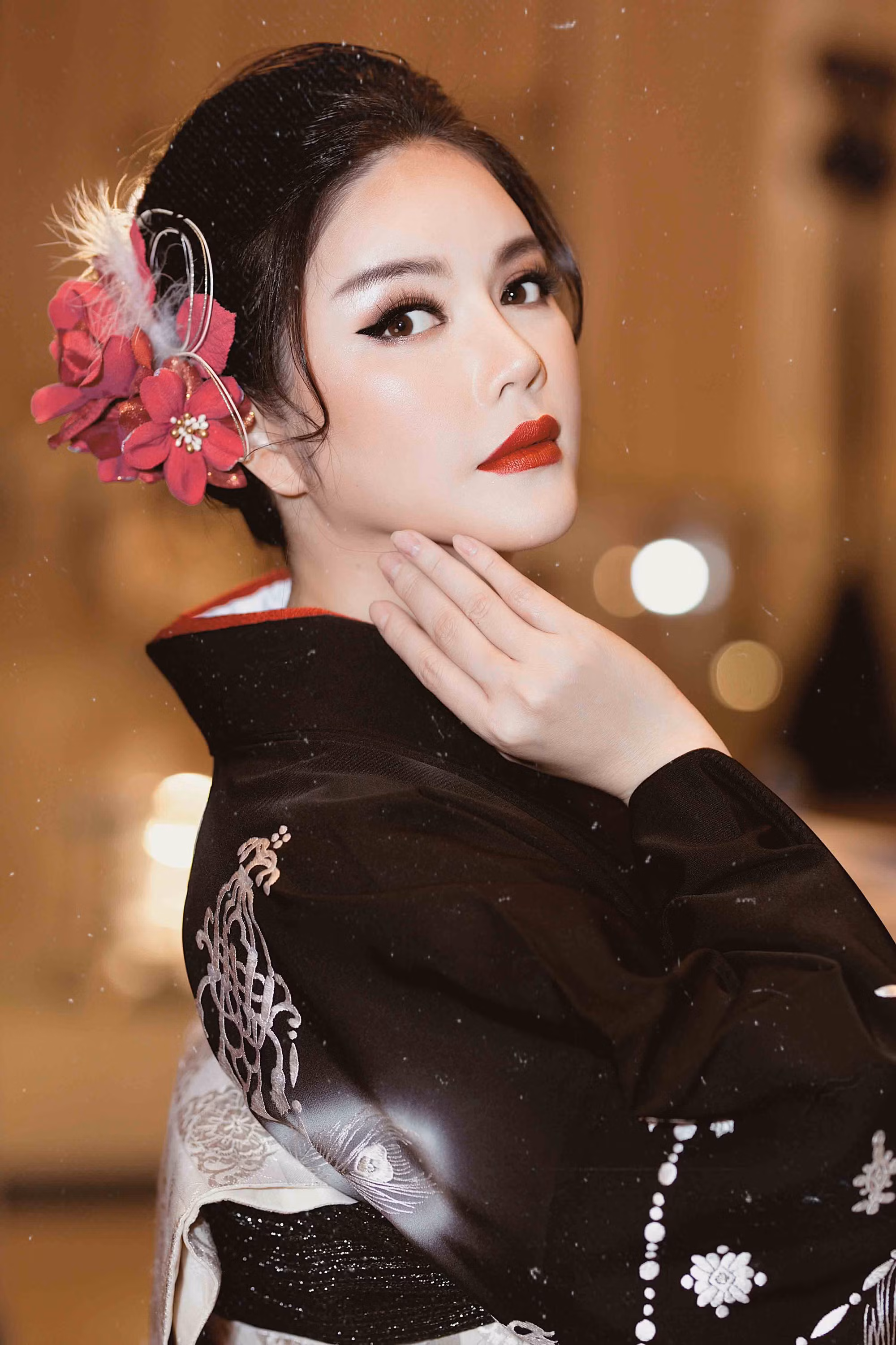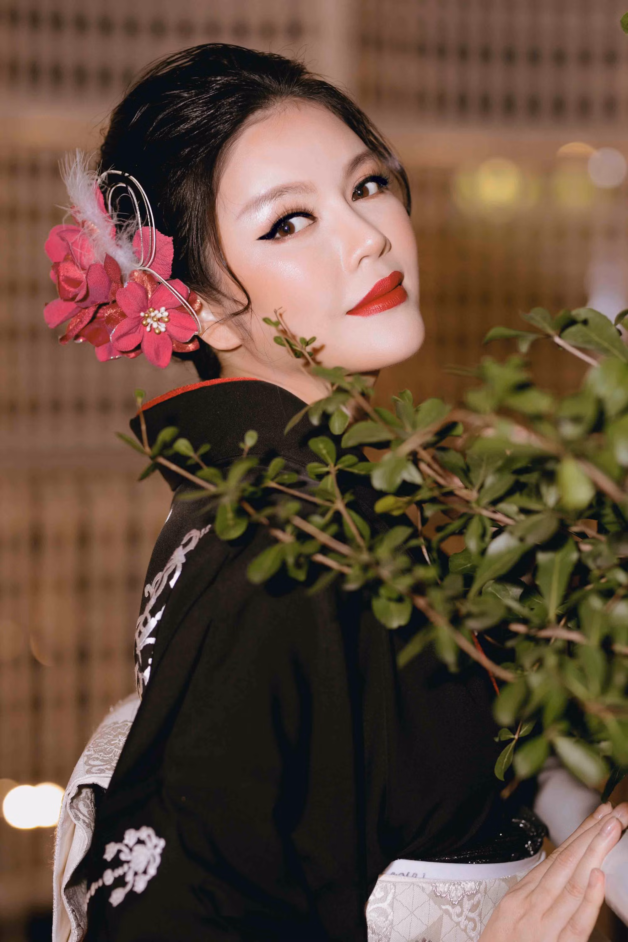 Trang phục tông đen, trắng, in họa tiết truyền thống của Nhật Bản được phối cùng guốc gỗ geta. Cô chọn kiểu tóc búi cao cổ điển, phù hợp nhất để tôn lên khuôn mặt và phần cổ. Người đẹp tinh tế trang trí thêm bằng phụ kiện hoa cài tóc nhẹ nhàng.