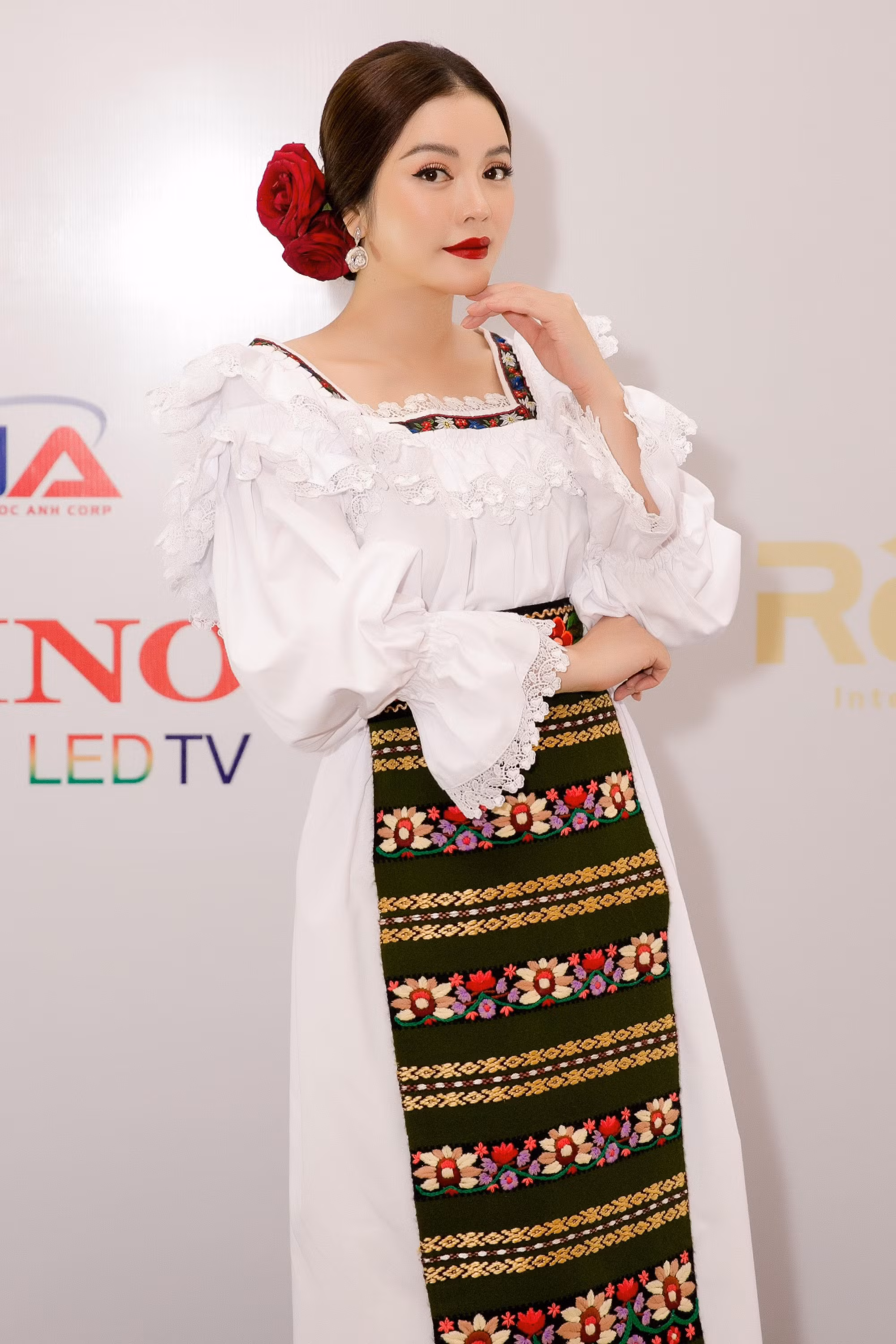Trong trang phục truyền thống của Romania, bà Trần Thị Thanh Nhàn phát biểu tại lễ kỷ niệm, bày tỏ vui mừng được đóng góp sức mình vào việc thúc đẩy quan hệ hợp tác giữa hai nước.