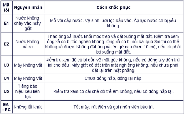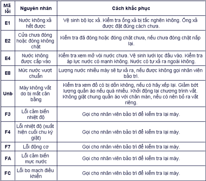 Trong các thiết bị điện tử trong gia đình thì máy giặt là thiết bị thuận lợi nhất để hiển thị những mã lỗi cơ bản từ đó người dùng có thể biết hướng khắc phục. Tất nhiên một số lỗi người dùng có thể xử lý được ngay, còn một số lỗi sẽ phải gọi nhân viên hỗ trợ kỹ thuật.