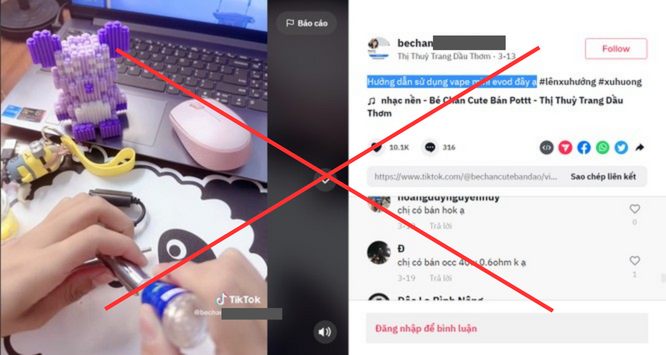 Chẳng hạn như một TikToker có tên là bechancute... đã đăng video "hướng dẫn sử dụng vape mini evod đây ạ". Video này đã nhận được 10 nghìn like và 360 bình luận, đa phần. là bình luận hỏi giá và hỏi mua.