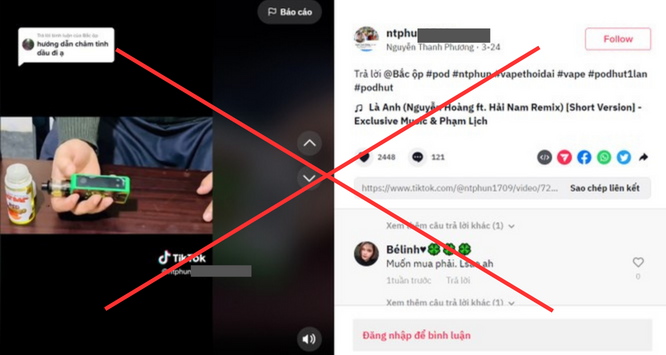 Một tài khoản khác có nick là ntph... (Nguyễn Thanh Phương) lại hướng dẫn cách châm tinh dầu vào thuốc lá điện tử. Clip đã có hơn 68.000 lượt xem và có rất nhiều câu hỏi mua sản phẩm ở đâu. Tương tự nick vapesho... (shop vape Hai Bà Trưng) đã chỉ ra 3 trường hợp châm tinh dầu sai cách.