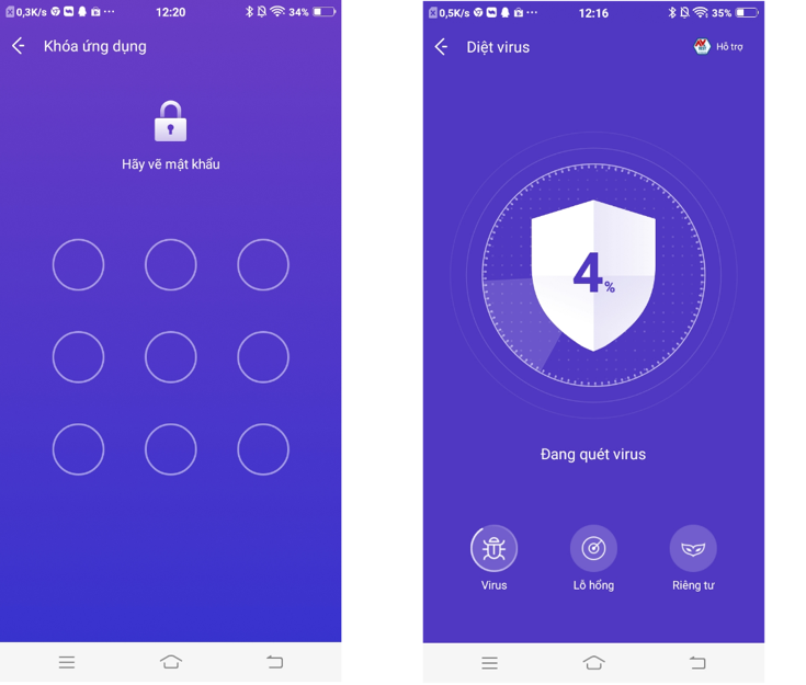 Chức năng bảo vệ bao gồm : Diệt virut - Bảo vệ điện thoại khỏi các phần mềm độc hại, quảng cáo hoặc những truy cập trực tuyến có chứa virut bất cứ lúc nào. Khóa Ứng Dụng - cung cấp cho người dùng với an ninh tuyệt đối, đề phòng mọi truy cập không mong muốn đến những ứng dụng mạng xã hội như Facebook, Instagram, Gmail hay thậm chí Danh Bạ. Mọi thông tin cá nhân (ảnh, cuộc gọi & tin nhắn) đều sẽ được giữ an toàn với hệ thống bảo vệ siêu việt của Nox Cleaner. Hình vẽ mật khẩu giúp bạn mở & khóa ứng dụng thuận tiện nhất.