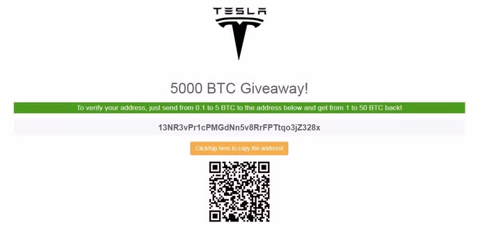 "Ai kiếm được 2 BTC hoặc 20 ETH nhanh nhất sẽ được tặng một chiếc Tesla Model 3, ship tận nhà. Phần thưởng chỉ có một", trang web mạo danh nói.
