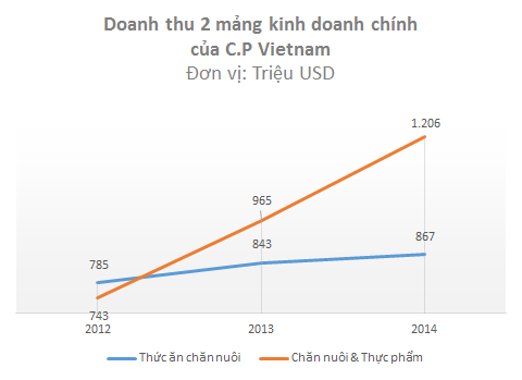 Năm 2012, doanh thu thức ăn chăn nuôi của C.P Vietnam vẫn lớn hơn doanh thu chăn nuôi – thực phẩm. Nhưng đến năm 2014, doanh thu từ chăn nuôi – thực phẩm đã bỏ xa doanh thu từ thức ăn.