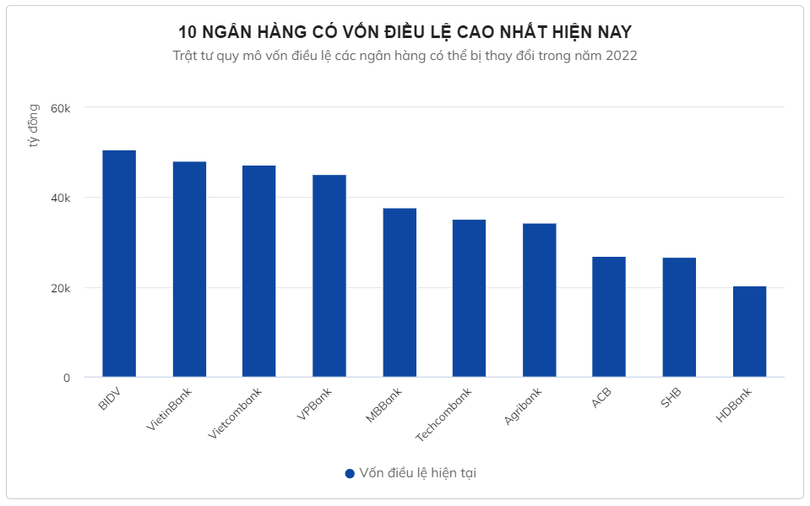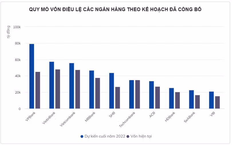 Với kế hoạch kể trên, đến cuối năm 2022, VietinBank và Vietcombank có thể ghi nhận mức vốn điều lệ xấp xỉ 2,5 tỷ USD quy đổi. Tuy nhiên, cả 2 nhà băng này sẽ không còn duy trì vị thế dẫn đầu hệ thống về quy mô vốn, khi mà VPBank đang có kế hoạch tăng vốn điều lệ lên trên 79.000 tỷ đồng ngay trong năm nay.