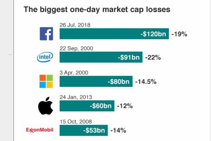 Ngày 26/7, giá cổ phiếu của Facebook giảm sốc tới 19% khiến giá trị vốn hóa của mạng xã hội lớn nhất thế giới này 120 tỷ USD. Con số này là mức kỷ lục trong lịch sử chứng khoán Mỹ. Chưa từng có công ty nào trên thị trường chứng khoán Mỹ chịu mức tổn thất giá trị vốn hóa ở mức 100 tỷ USD chỉ trong vòng 1 ngày.