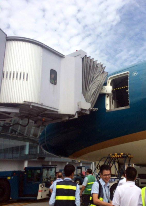 Vụ việc xảy ra khoảng 9h40 sáng 4/7, máy bay 787-9 của VNA mang số hiệu chuyến VN237 có hành trình từ Hà Nội đi TP.HCM dự kiến thời gian bay 9h55 đã gặp phải tai nạn hi hữu với ống lồng và cửa ra vào máy bay phía đầu.