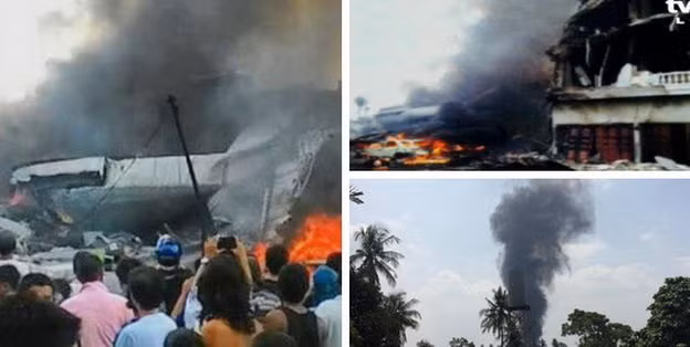 Hình ảnh đăng tải trên mạng xã hội cho thấy khói đen cuồn cuộn bốc lên từ nơi máy bay rơi xuống, nhiều ô tô bị hư hại và nhà dân chìm trong biển lửa, cùng đám đông người dân đang đổ xô tới xem.