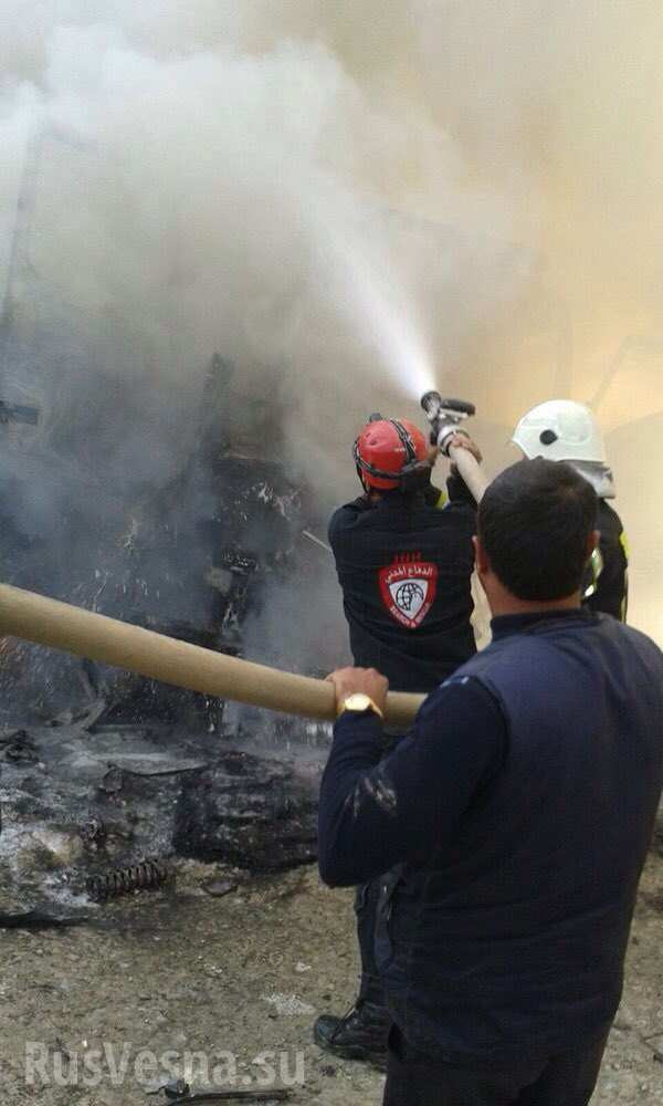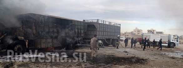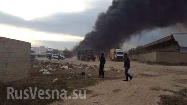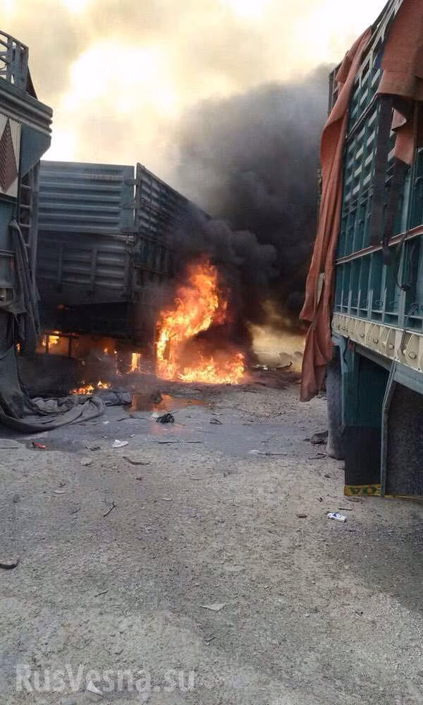 Hỏa hoạn lan đến cả khu nhà xe chứa các xe vận tải còn mới, đưa sang Syria để bán. Ngọn lửa đã thiêu hủy khoảng 20 xe vận tải. Có thông tin cho rằng ngọn lửa bùng phát khi đoàn xe bị trúng bom.