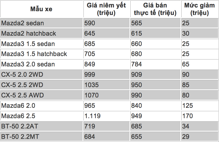 Trong bối cảnh đó, các hãng xe cố gắng đẩy hàng bằng các chiêu kích cầu như giảm giá, tặng quà hay chế độ hậu mãi hấp dẫn. Song quả thực Trường Hải đã khiến nhiều người phải sốc khi quyết định giảm giá khủng. Hai mẫu xe bán chạy nhất của Mazda là Mazda 3 và Mazda CX-5 có giá bán thực tế trong tháng 12 là 660 triệu đồng và 909 triệu đồng, chênh lệch với giá niêm yết lần lượt là 25 triệu đồng và 90 triệu đồng. Tuy nhiên, mức giảm sâu kỷ lục phải thuộc về Mazda 6 bản 2.5 với mức giá bán thực tế chỉ 949 triệu đồng, giảm tận 170 triệu đồng so với giá niêm yết.