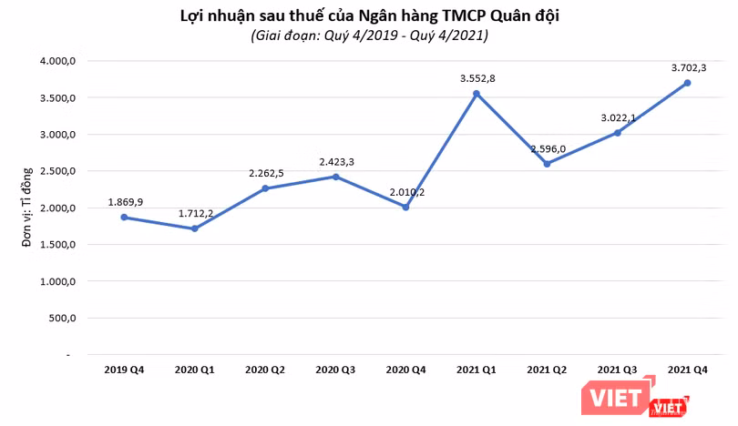Kết quý 4, MBBank báo lãi trước thuế năm 2021 đạt 16.527,2 tỉ đồng, vượt 25,2% kế hoạch đề ra. Trừ đi chi phí thuế thu nhập doanh nghiệp, MBBank báo lãi ròng 13.221,4 tỉ đồng, tăng gấp rưỡi so với năm 2020.