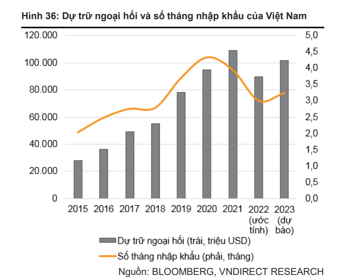 Trước đó, CTCP Chứng khoán VNDirect (VNDirect) cho biết, trong 10 tháng đầu năm 2022, NHNN đã phải bán ra khoảng 20% dự trữ ngoại hối trong 10 tháng đầu năm 2022, kéo theo dự trữ ngoại hối của Việt Nam giảm xuống dưới mức khuyến nghị của IMF (thấp hơn 3 tháng nhập khẩu).