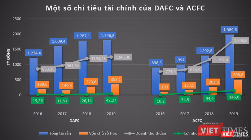 Tương tự tại ACFC, năm 2019, doanh thu thuần của DAFC đạt 1.808,6 tỷ đồng, gấp hơn 2 lần so với năm 2016; đồng thời, lợi nhuận thuần tăng hơn 14 lần từ 10,2 tỷ đồng năm 2016 lên 145,6 tỷ đồng năm 2019.