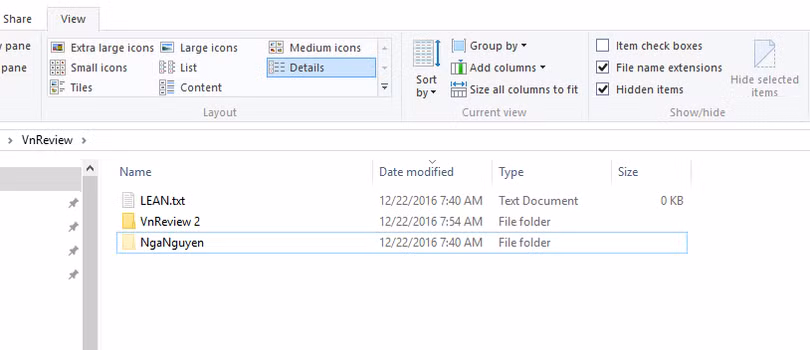 Khi file và thư mục bị ẩn, bạn sẽ không thấy chúng trên File Explorer. Để xem chúng, bạn hãy chọn thẻ Viewở trên cùng cửa sổ File Explorer. Tiếp đến, bạn tìm đến phần Show/Hide và bạn sẽ thấy một hộp kiểm có tênHidden Items. Để xem tất cả các file và thư mục ẩn, bạn hãy đánh dấu chọn vào hộp kiểm đó. Tất cả các file và thư mục có thuộc tính ẩn sẽ bị mờ đi để bạn phân biệt chúng với các file thông thường.