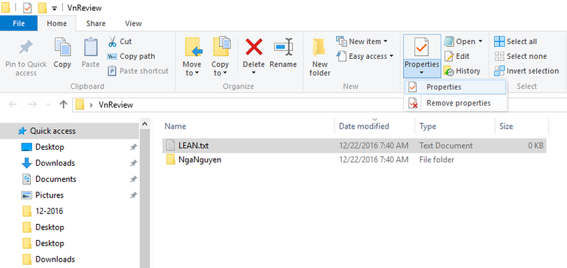 1. Đầu tiên, bạn mở File Explorer và di chuyển đến file hoặc thư mục bạn muốn ẩn. Kế đến, bạn chọn file hoặc thư mục đó và nhấn nút Properties > Properties từ thanh Ribbon. Hoặc bạn cũng có thể nhấn chuột phải lên file hoặc thư mục và chọn Properties.