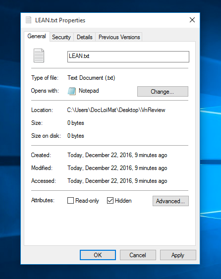 2. Tại cửa sổ Properties, bạn tìm đến phần Attributes nằm gần dưới cùng cửa sổ. Ở đây, bạn sẽ thấy hai hộp kiểm lần lượt tên là Read-Only và Hidden. Để ẩn file, bạn chỉ cần đánh dấu chọn vào hộp kiểm Hidden. Cuối cùng, bạn nhấn nút OK hoặc Apply.