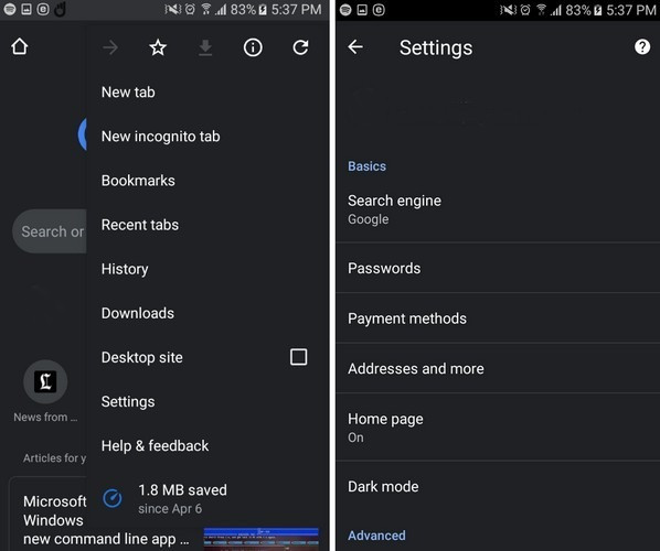 Câu chuyện vẫn chưa kết thúc ở đó bởi vì bạn vẫn cần phải bật dark mode cho ứng dụng. Một lần nữa, bạn mở Chrome và không nhập bất kỳ thông tin gì vào thanh địa chỉ. Bấm nút hình ba dấu chấm ở phía trên góc phải, và chọn Settings (Cài đặt).