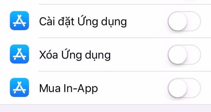 Cuối cùng, để cấm người khác mua thêm tính năng trên ứng dụng, game, bạn chuyển công tắc In-App Purchases (Mua In-App) sang vị trí OFF (Tắt).