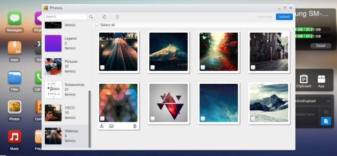 Ứng dụng này cũng hoạt động tương tự Image Transfer trên iOS. Người dùng khi sử dụng AirDroid cũng nhận được một địa chỉ IP của điện thoại sau đó truy cập vào địa chỉ này. Giao diện trên trình duyệt máy tính sẽ hiện ra các tuỳ chọn cho người dùng, trong đó có Photos. Khi đó toàn bộ ảnh trên smartphone Android sẽ được hiển thị tại đây. Việc rất đơn giản sau đó là chọn các file mình muốn sau đó bấm vào biểu tượng tải về là các bức ảnh sẽ được chuyển sang máy tính.