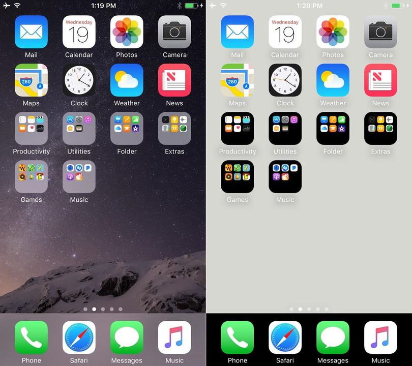 Trước đây, nhiều người dùng iOS đã thành công trong việc biến thư mục vuông thành thư mục bo tròn bằng cách áp dụng một hình nền đặc biệt. Với cùng cách làm như vậy, bạn cũng có thể biến màu nền của thư mục và thanh Dock từ xám sang đen.
