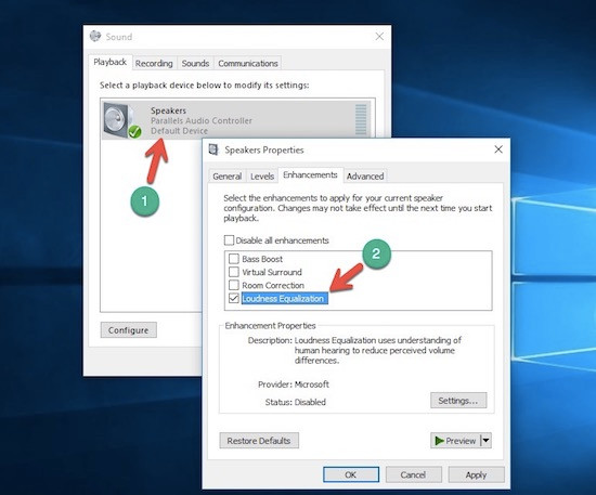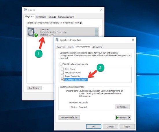 - Bước 3: Cuối cùng, bạn chỉ cần chuyển sang thẻ Enhancements, đánh dấu vào ô Enable Loudness equalization, nhấn Apply > OKđể lưu lại.