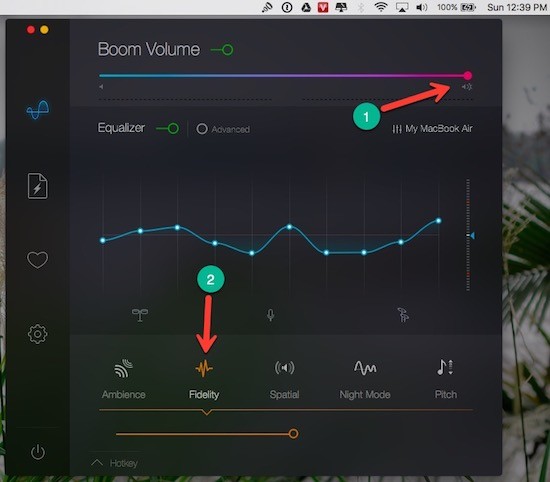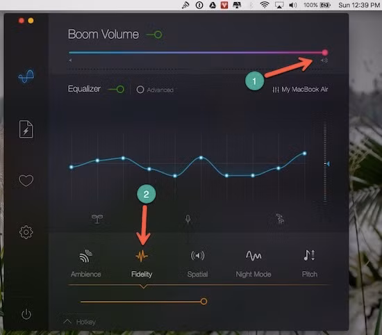 - Bước 2: Trong giao diện Boom 2, bạn hãy kéo thanh trượt âm lượng lên mức tối đa. Chuyển đổi qua lại giữa các chế độ Ambience, Fidelity, Spatial… đồng thời kích hoạt thêm các đạo cụ đi kèm, đơn cử như trống, micro. Theo thử nghiệm của người viết, Boom 2 giúp tăng chất lượng và âm lượng trên máy gần như gấp đôi so với bình thường.