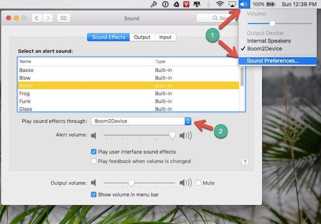 - Bước 1: Đầu tiên, bạn hãy nhấn vào biểu tượng loa ở góc trên bên phải và chọn Sound Preferences. Tiếp theo, bạn thiết lập lại là Boom2Device tại hai mục Sound Effects và Output.