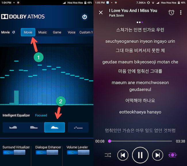 Khi cài đặt hoàn tất, bạn hãy mở ứng dụng Dolby Atmos và kích hoạt cả ba tùy chọn Surround Virtualizer, Dialohue Enhancer, Volume Leveler để tăng chất lượng âm thanh. Để có được kết quả tốt nhất, bạn nên lựa chọn đúng chế độ với thể loại đang xem, đơn cử như Movie (phim ảnh), Music (âm nhạc), Game (trò chơi)… hoặc thay đổi biểu đồ âm thanh tùy ý.