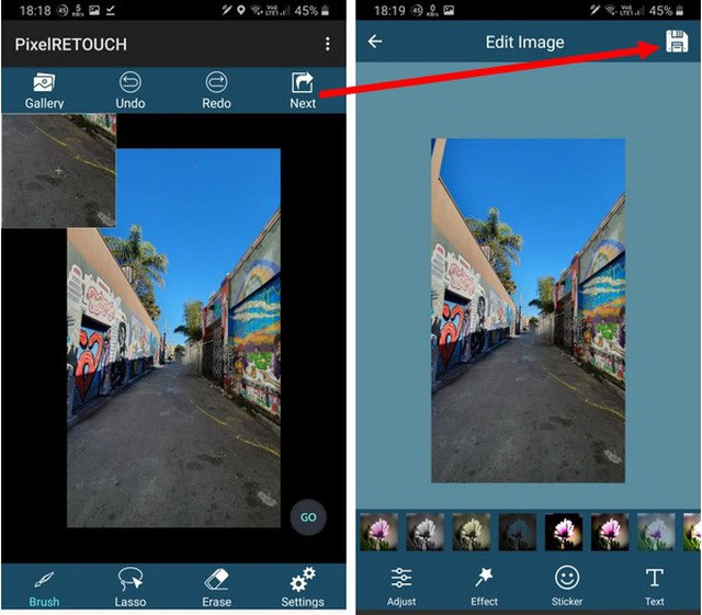 Nếu đã cảm thấy ưng ý với hình ảnh sau khi xử lý, bạn nhấn “Next”, sau đó nhấn vào biểu tượng chiếc đĩa mềm để lưu lại hình ảnh đa xử lý vào smartphone.