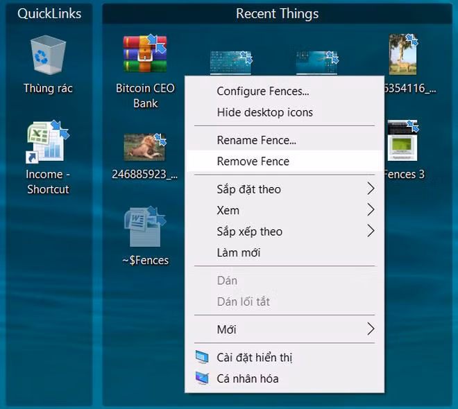 Người dùng có thể kích chuột phải vào một nhóm biểu tượng và chọn "Remove Fences" để xóa một nhóm ra khỏi desktop. Các biểu tượng nằm trong nhóm đó vẫn xuất hiện trên desktop, nhưng sẽ nằm ở dạng tự do (không thuộc nhóm nào). Người dùng có thể kéo chuột để di chuyển và sắp xếp vị trí của chúng vào các nhóm sao cho phù hợp nhất.