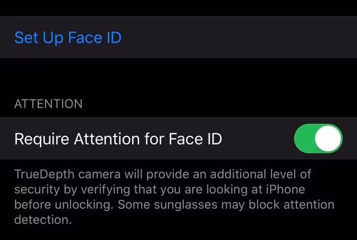 Bạn cũng nên thử tắt tùy chọn Require Attention for Face ID (Yêu cầu chú ý đến Face ID). Điều này có thể cải thiện cơ hội Face ID hoạt động khi bạn đeo khẩu trang. Tuy nhiên hãy nhớ rằng việc tắt tùy chọn này sẽ khiến Face ID kém an toàn hơn một chút, vì nó sẽ loại bỏ lớp xác thực yêu cầu bạn phải mở mắt và nhìn vào màn hình để mở khóa điện thoại. Bạn nên bật lại tùy chọn này khi sau này không cần dùng đến khẩu trang phòng dịch nữa.