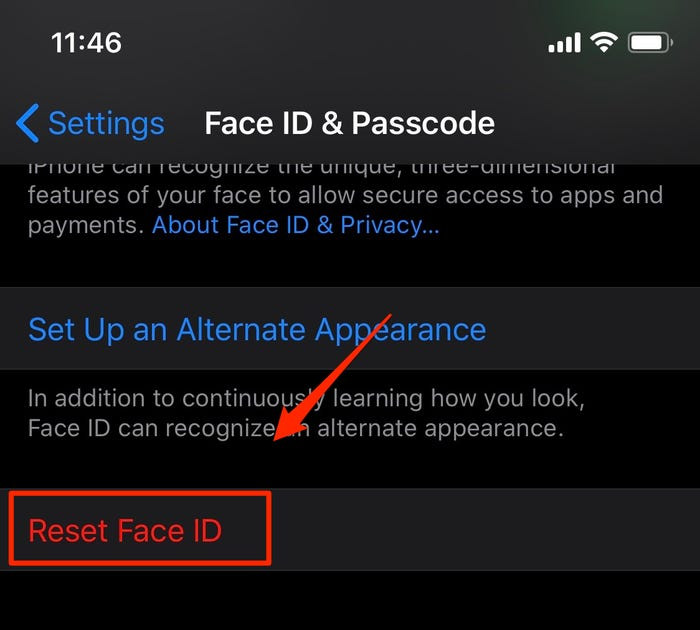 Đầu tiên, mở menu Settings (Cài đặt), cuộn xuống Face ID and Passcode (Face ID và mật mã), chọn Reset Face ID (Thiết lập lại Face ID)