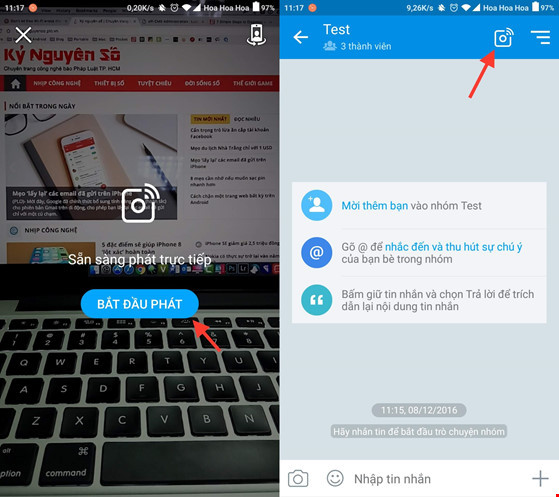- Bước 3: Khi hoàn tất, người dùng chỉ cần nhấp vào biểu tượng live stream ở góc trên bên phải, thiết lập camera trước/sau rồi nhấn Bắt đầu phát. Trong quá trình phát, bạn có thể nhắn tin, gửi sticker, xem số lượng người đang theo dõi... Sau khi dừng phát, video sẽ được lưu lại trong nhóm và các thành viên khác có thể xem lại bất cứ lúc nào.