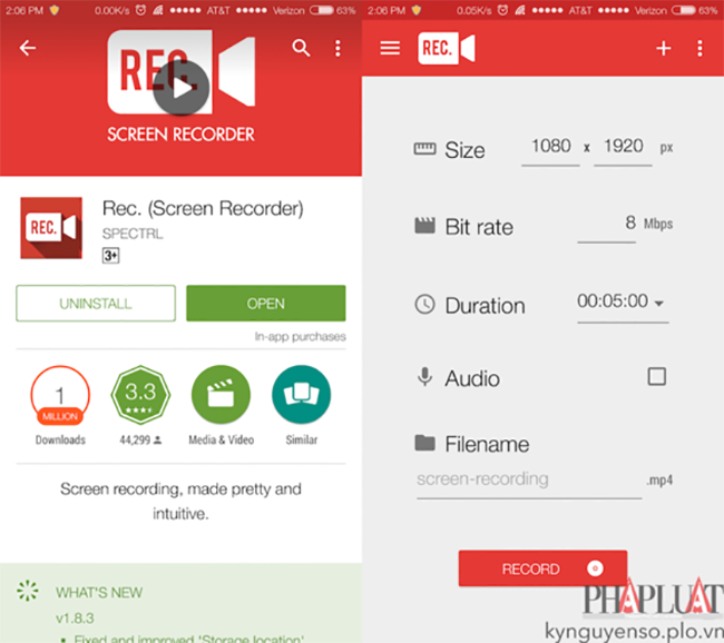 Nếu đang sử dụng Android 4.4, bạn chỉ cần cài đặt ứng dụng Rec tại địa chỉ https://goo.gl/9fVTvq. Để bắt đầu, người dùng cần phải thiết lập độ phân giải (Size), Bit Rate, thời gian quay (Duration), đường dẫn lưu trữ (Filename). Lưu ý, để ghi lại âm thanh, bạn phải kích hoạt tùy chọn Audio rồi nhấn Record.